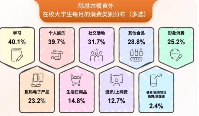 数据显示,除基本餐食之外,生活费主要花销为: