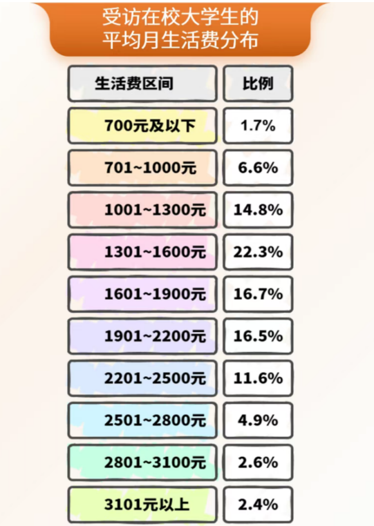2025年研究显示,大学生平均每月生活费为1744元。同时,生活费在1301-1600元区间的占比最高。你在哪一个层级?快来分享一下吧~