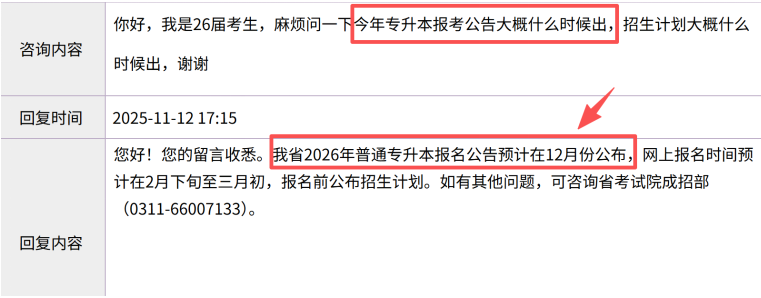 河北教育考试院明确发布:26年普通专升本报考公告预计在12月份公布,网上报名时间预计在2月下旬至3月初,报名前公布招生计划。